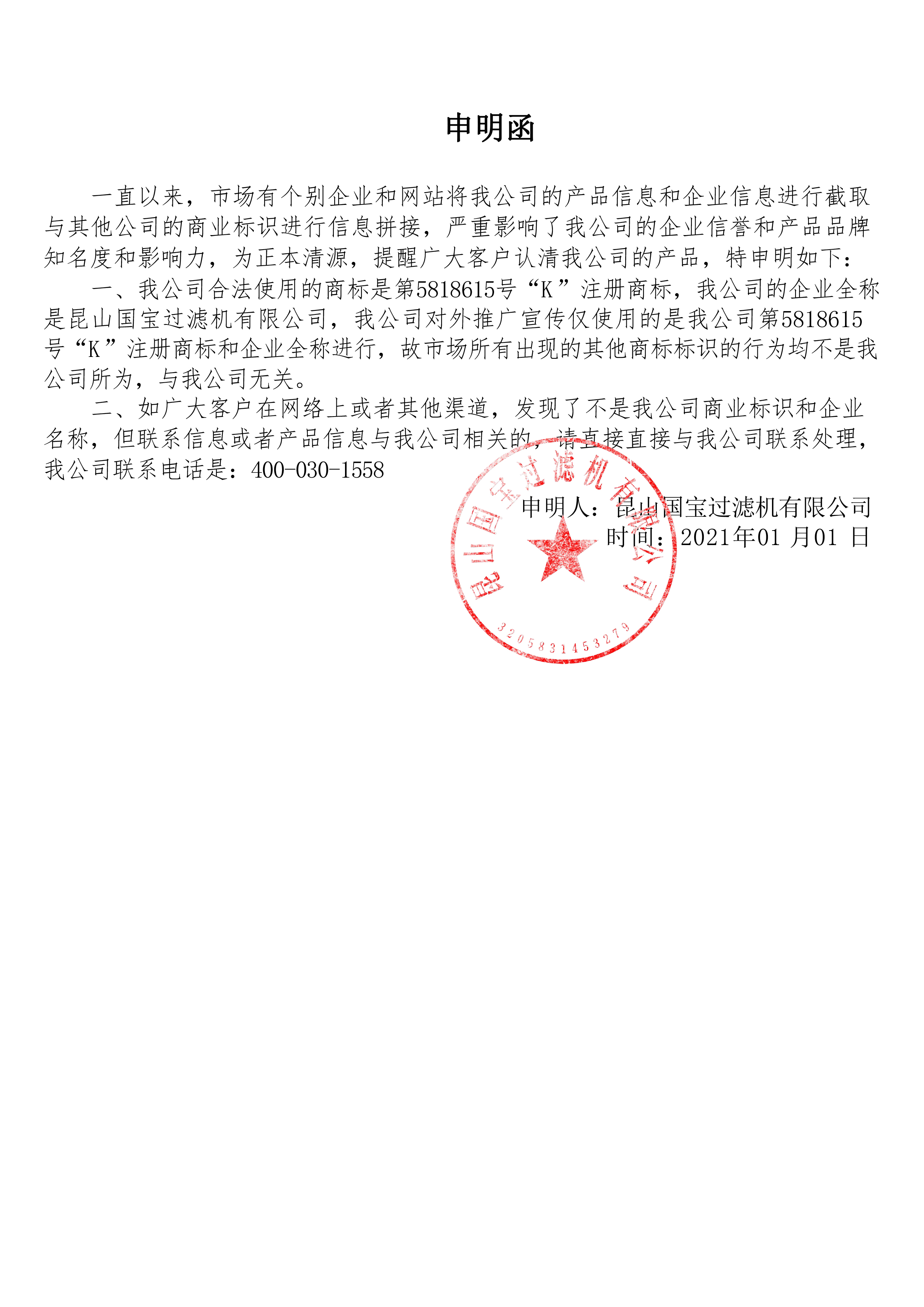 一、我公司合法使用的商標是第5818615號“K”注冊商標,我公司的企業(yè)全稱是昆山國寶過濾機有限公司,我公司對外推廣宣傳僅使用的是我公司第5818615號“K”注冊商標和企業(yè)全稱進行,故市場所有出現(xiàn)的其他商標標識的行為均不是我公司所為,與我公司無關。